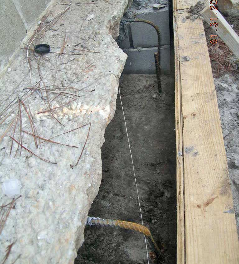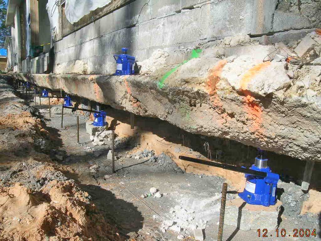 We built block and concrete piers next to each jack tying them into the old footing with steel dowels then removed the jacks. Then we formed up and poured a new foundation wall solid all along the back side of the house. You can see the wood concrete forms in place on the right. Next we drilled cut holes in the slab inside the house and pumped a concrete slurry mix into them filling all the voids underneath the house slab.