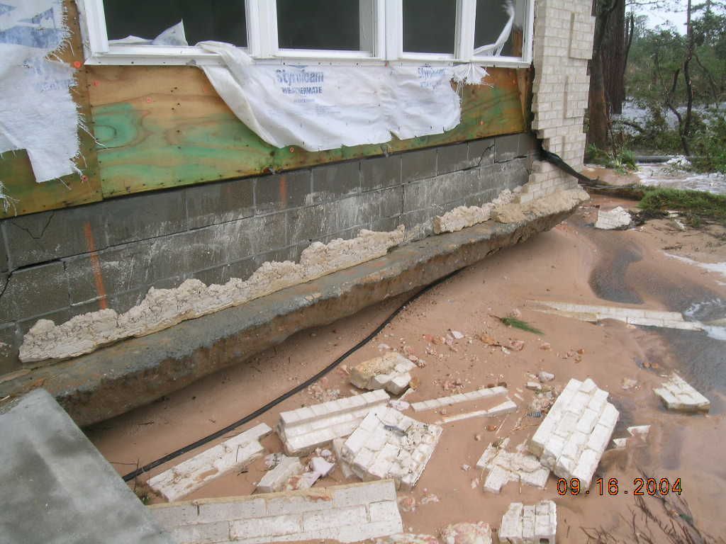 Hurricane Ivan's storm surge undermined the Horan's foundation. The back porch has fallen away from the house. There were large voids under the slab beneath the house. There was about 5' of water inside the house.