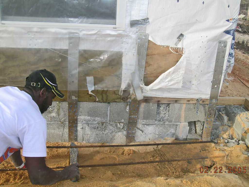 We attached heavy duty metal straps with concrete screw anchors from the old block to the frame walls in order to restore the connections between the old foundation walls and the wood walls.