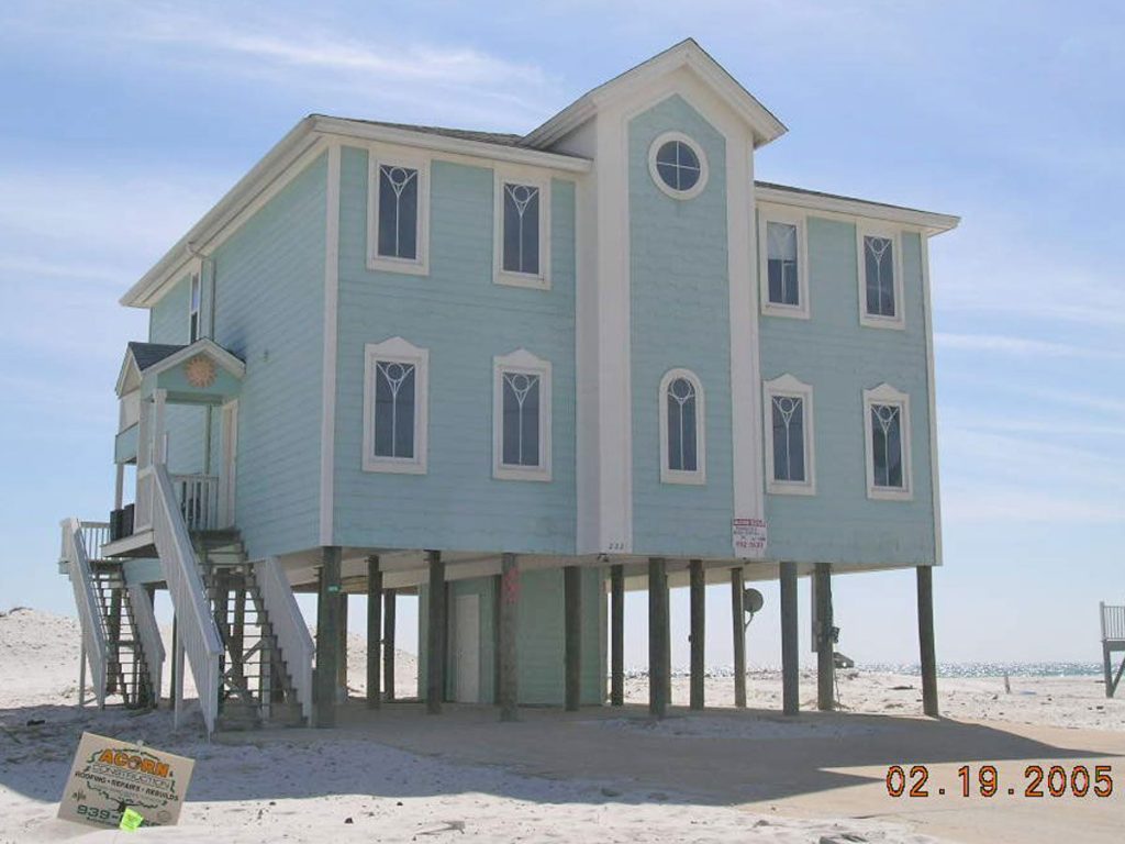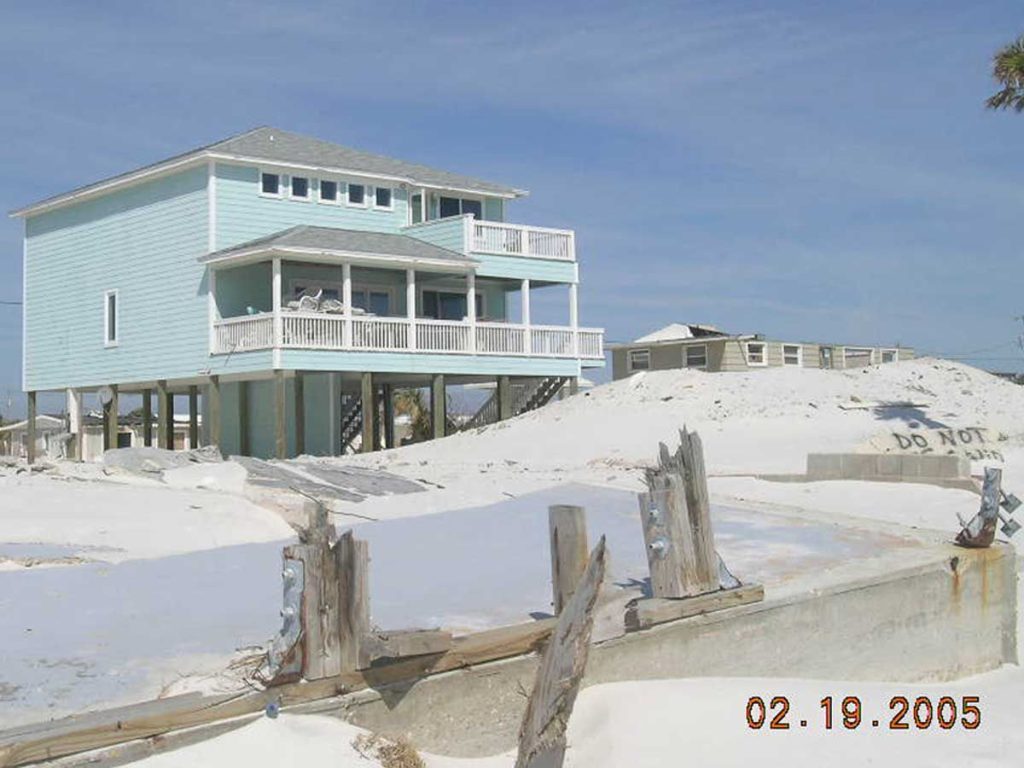 I built this home on Pensacola Beach in 1999 and it did quite well during hurricane Ivan. As you can see in the foreground, not all its neighbors were so lucky. It lost a few shingles and as a result there was some internal water damage. This points out the value of a good subroof. This was one of the first homes ready for the 2005 summer rental market.