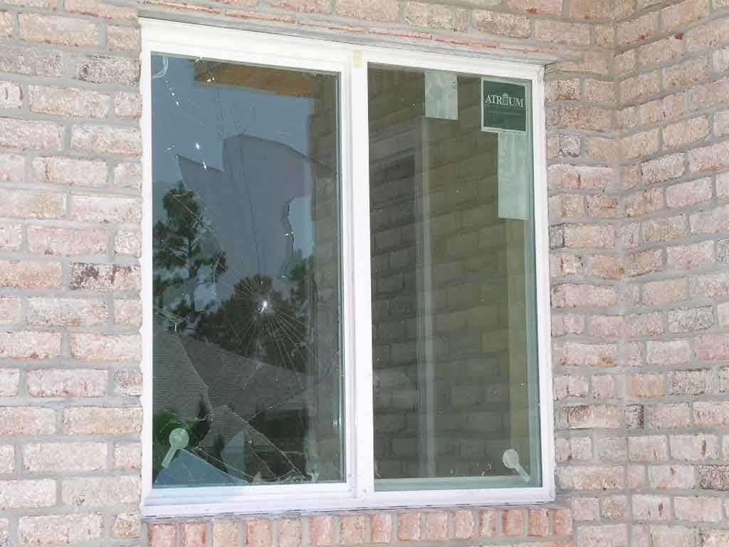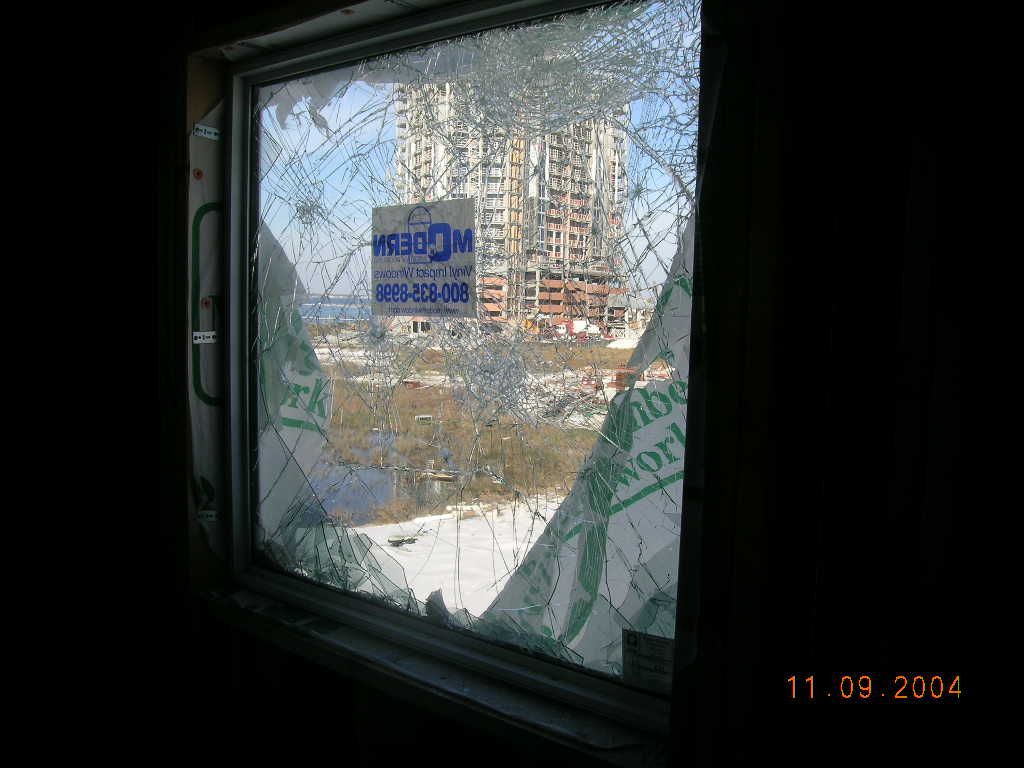 This is why impact glass windows are so important. This window is on the second floor of a beach house where putting up storm shutters would be difficult. A piece of debris hit this wall so hard during hurricane Ivan that it cracked two 2×6 wall studs and shattered the window. The window held and no internal damage occurred.