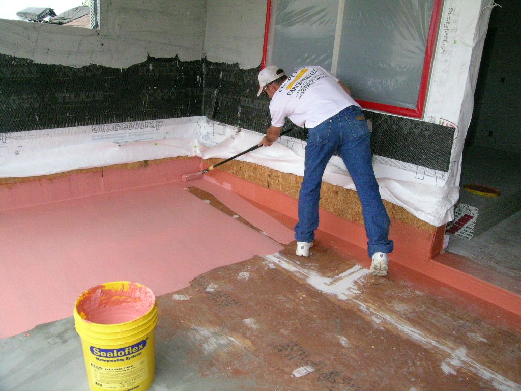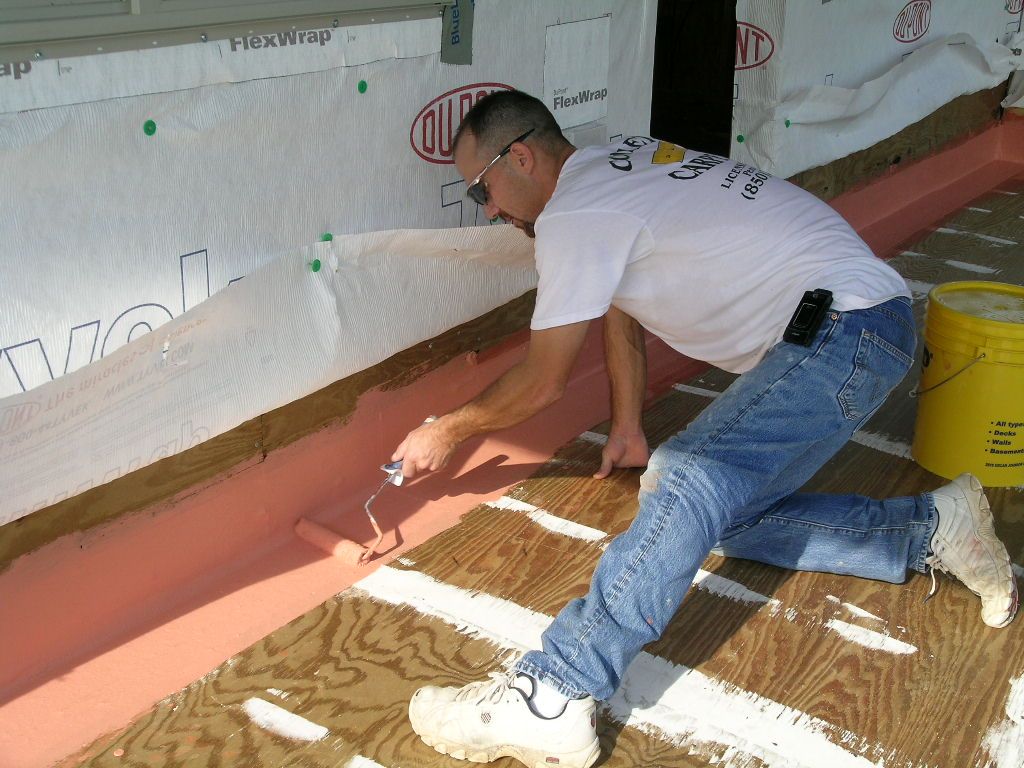 Darin rolls on a rubberized deck coating to seal the deck. Note how the flashing system rolls into the doorway before the door is installed.