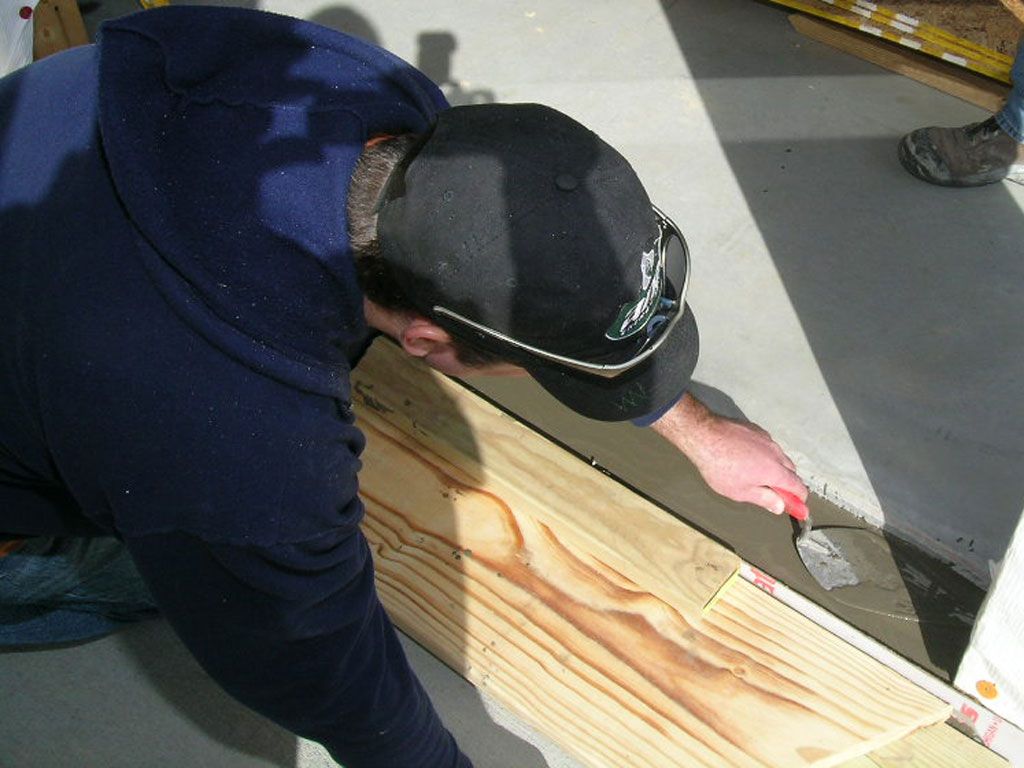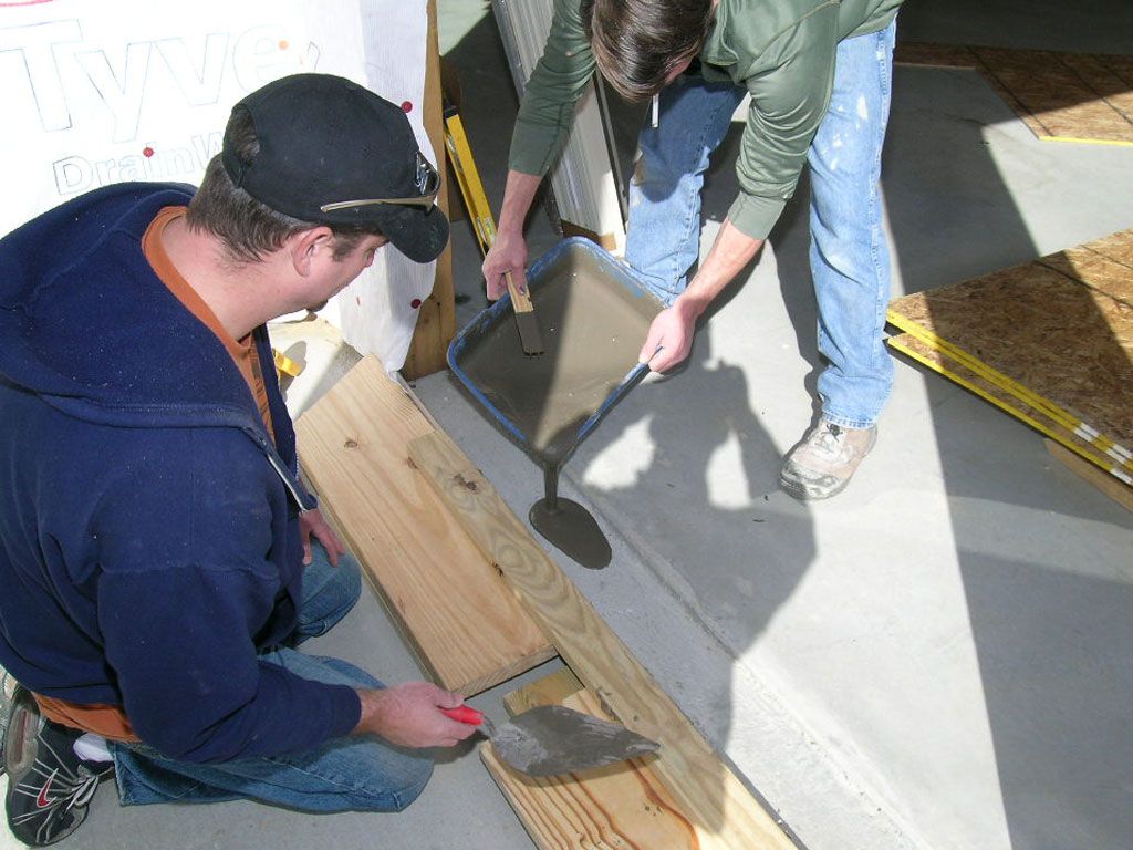 Steve pouring leveling compound under a sliding glass door threshold to create a perfectly level bed for the threshold track.