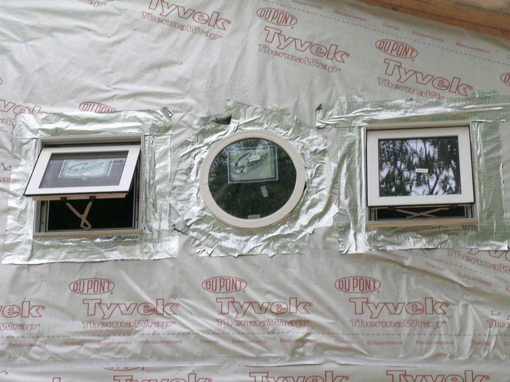 This is the WRONG way to seal and flash windows. I see this all the time. Taped all 4 sides, not lapped under the house wrap, flex tape not used on the round window. Any potential water intrusion around or above the windows will likely be trapped and promote wood rot. The manufacturer will not warranty this installation because it does not follow the instructions.